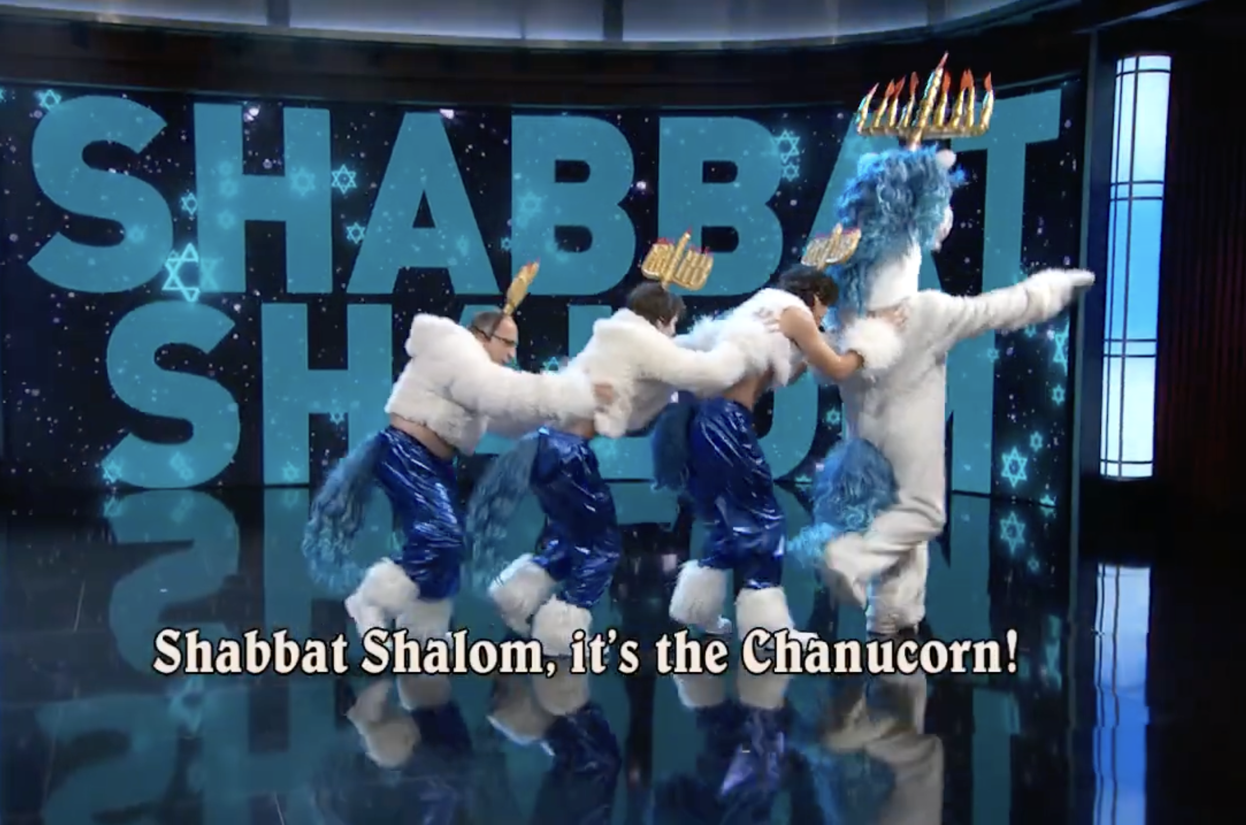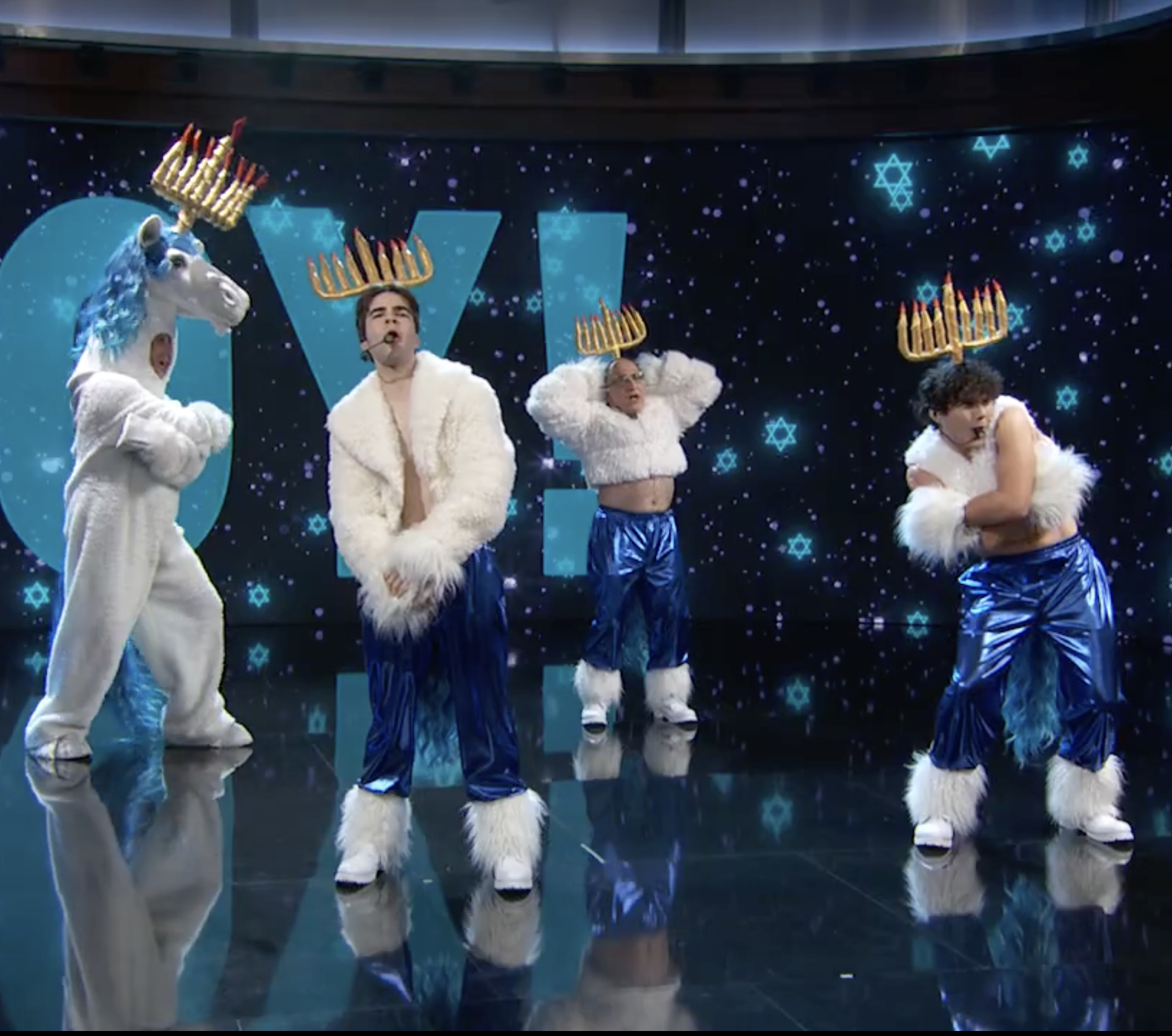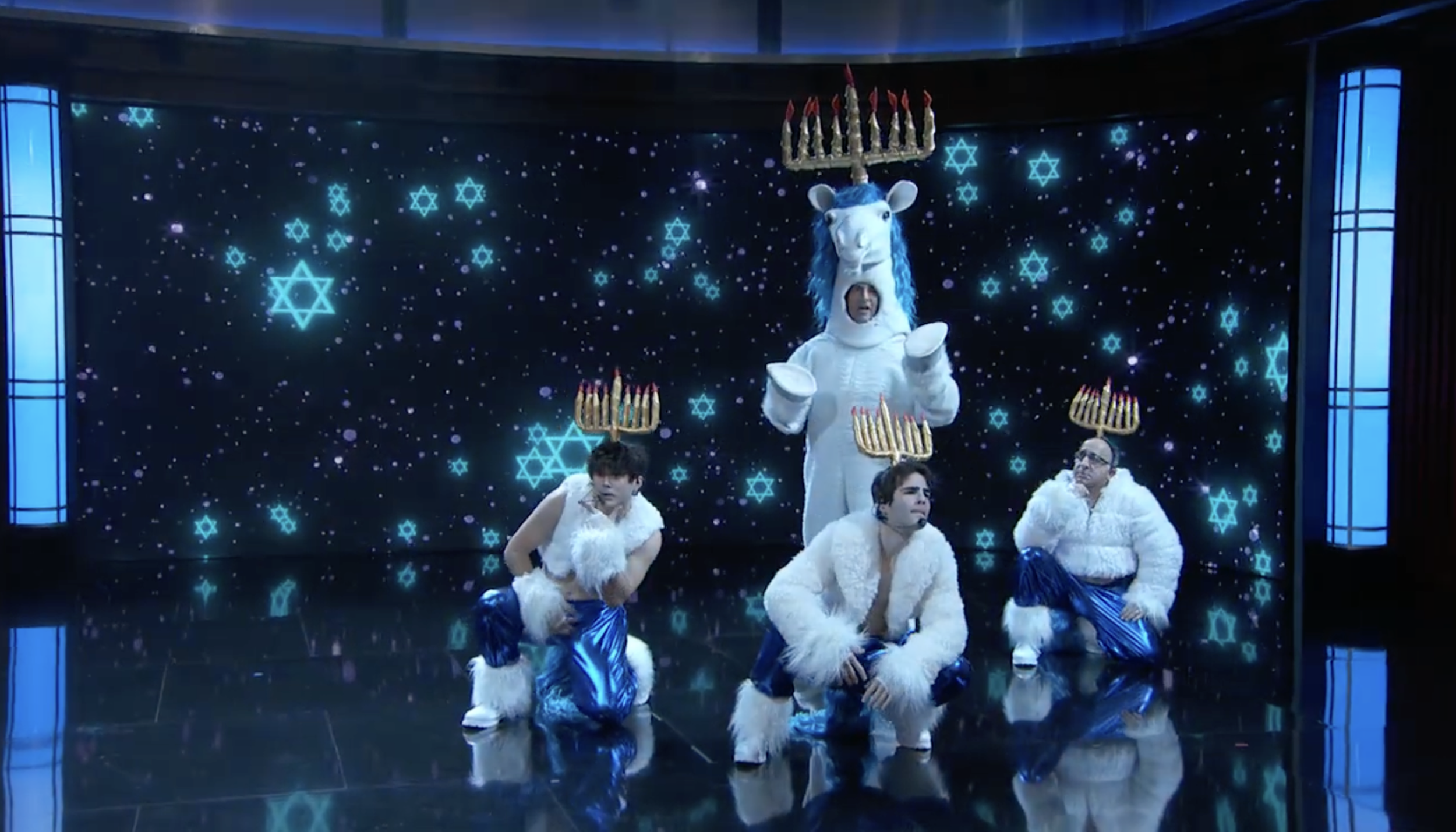 Bruno recently acted in and choreographed the Jimmy Kimmel Chanukkah-Unicorn sketch which featured the (fake, but real to him) boy band “IBS”.